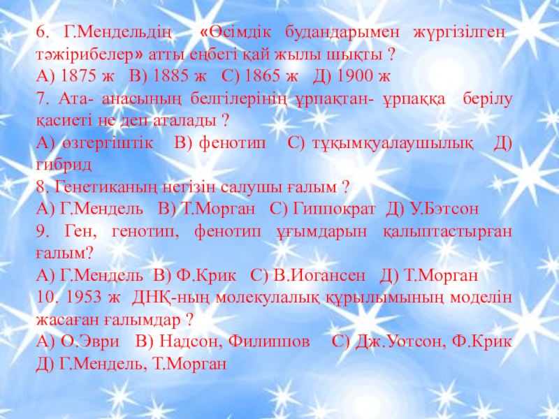 6. Г.Мендельдің «Өсімдік будандарымен жүргізілген тәжірибелер» атты еңбегі қай жылы шықты ?А) 1875 ж  В) 1885