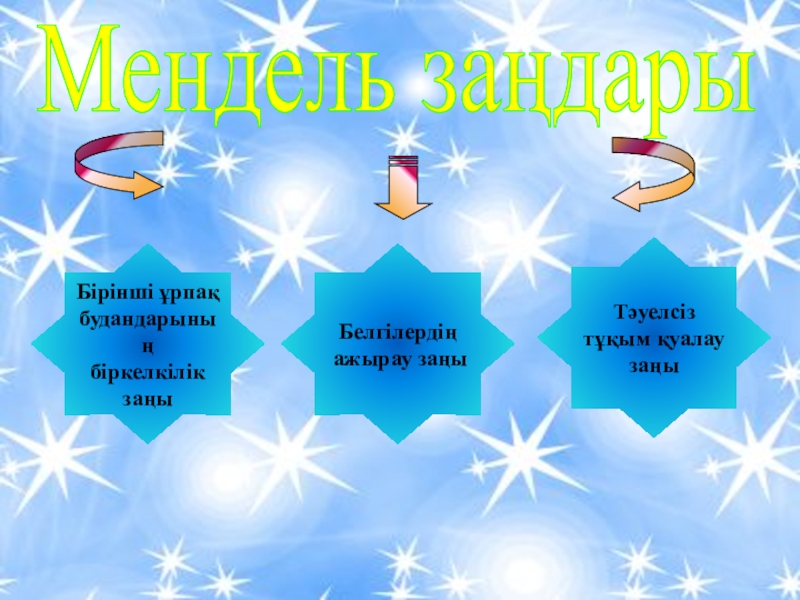 Мендель заңдарыБірінші ұрпақ будандарының біркелкілік заңыБелгілердің ажырау заңыТәуелсіз тұқым қуалау заңы