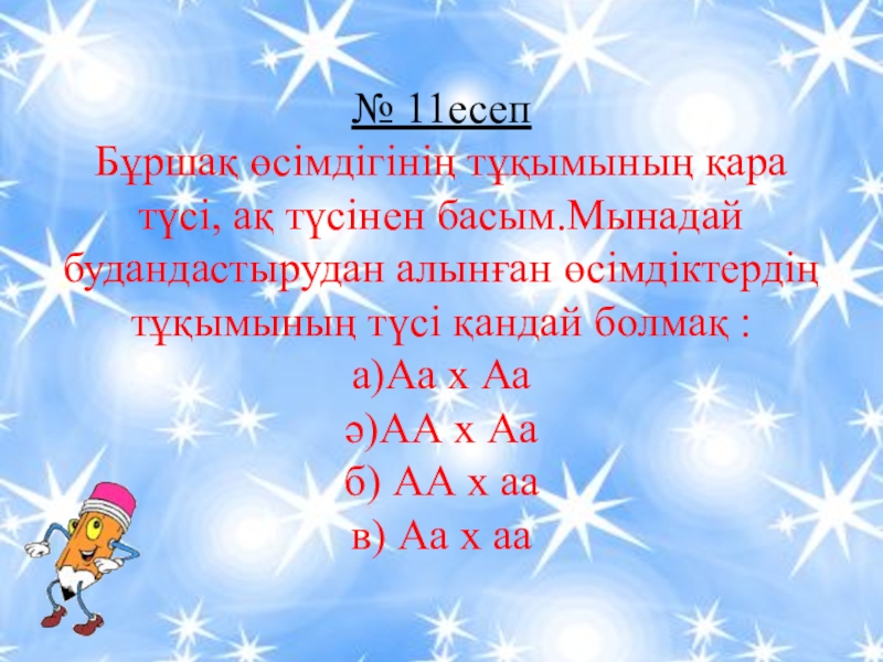 Слайд 24№ 11есеп Бұршақ өсімдігінің тұқымының қара түсі, ақ түсінен басым.Мынадай будандастырудан алынған