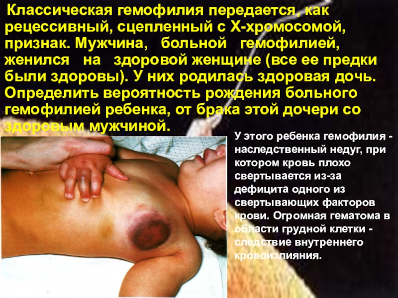 У этого ребенка гемофилия - наследственный недуг, при котором кровь плохо свертывается из-за дефицита одного из свертывающих факторов крови. Огромная гематома в области грудной клетки - следствие внутреннего кровоизлияния.