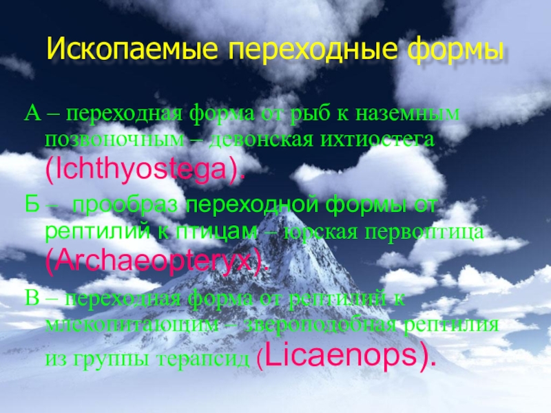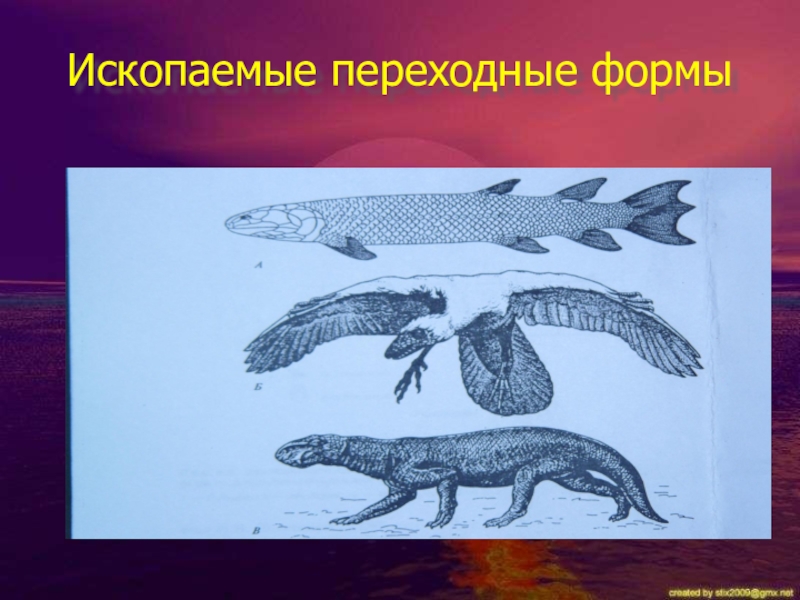 Ископаемые переходные формыА – переходная форма от рыб к наземным позвоночным – девонская ихтиостега (Ichthyostega).Б – прообраз
