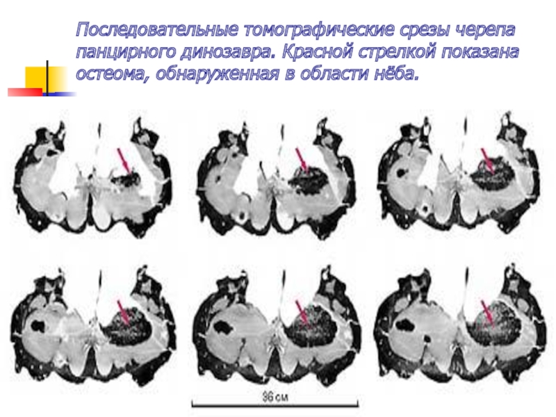 Слайд 12Последовательные томографические срезы черепа панцирного динозавра. Красной стрелкой показана остеома, обнаруженная