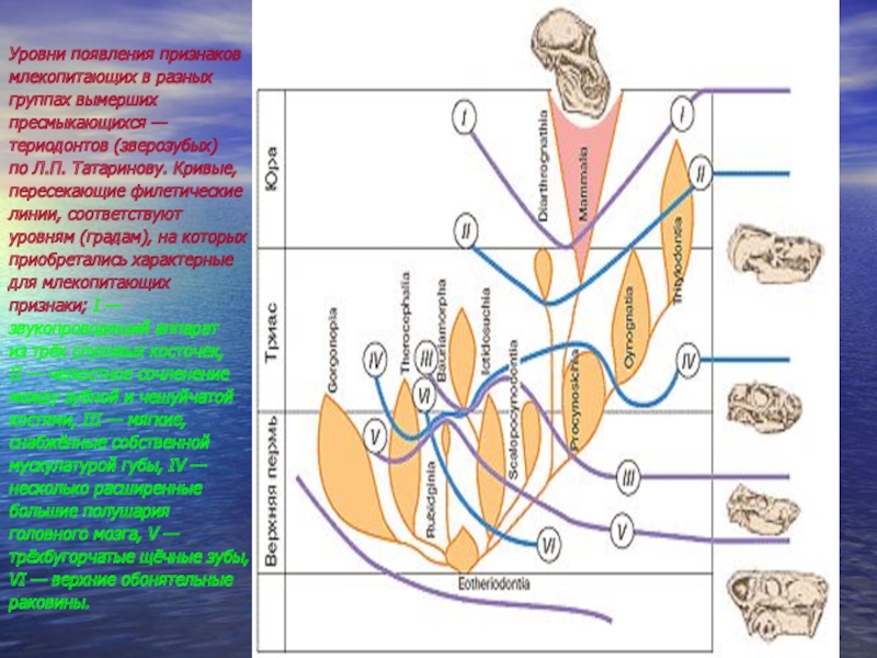 Уровни появления признаков млекопитающих в разных группах вымерших пресмыкающихся — териодонтов (зверозубых) по Л.П. Татаринову. Кривые, пересекающие филетические линии, соответствуют уровням