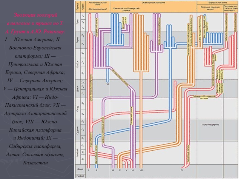 Эволюция зоохорий в палеозое и триасе по Т.А. Грунт и А.Ю. Розанову: I — Южная Америка; II — Восточно-Европейская платформа; III — Центральная и Южная Европа, Северная