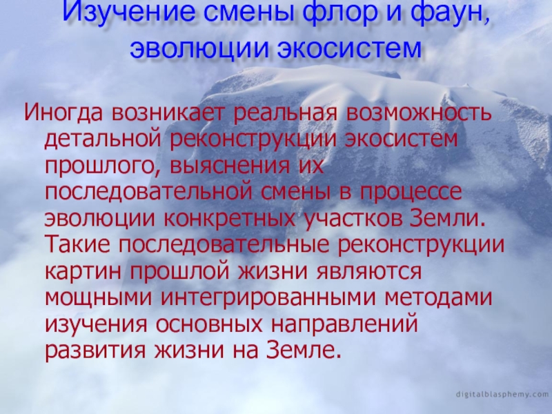 Изучение смены флор и фаун, эволюции экосистем Иногда возникает реальная возможность детальной реконструкции экосистем прошлого, выяснения их