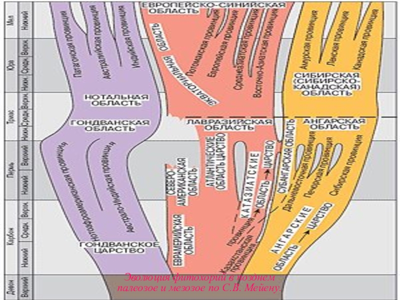 Слайд 10Эволюция фитохорий в позднем палеозое и мезозое по С.В. Мейену.
