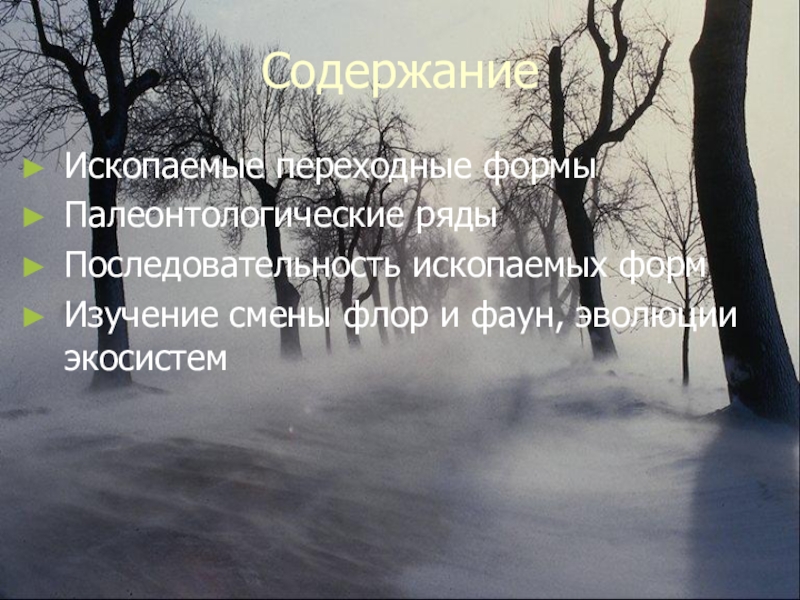 СодержаниеИскопаемые переходные формыПалеонтологические рядыПоследовательность ископаемых формИзучение смены флор и фаун, эволюции экосистем