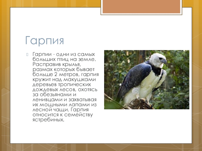 размах которых бывает больше 2 метров, гарпия кружит над макушками деревьев тропических дождевых лесов, охотясь за обезьянами и ленивцами и захватывая их мощными лапами из лесной чащи. Гарпия относится к семейству ястребиных.