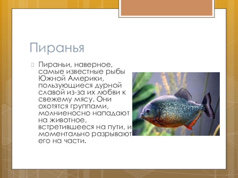 ПираньяПираньи, наверное, самые известные рыбы Южной Америки, пользующиеся дурной славой из-за их любви к свежему мясу. Они