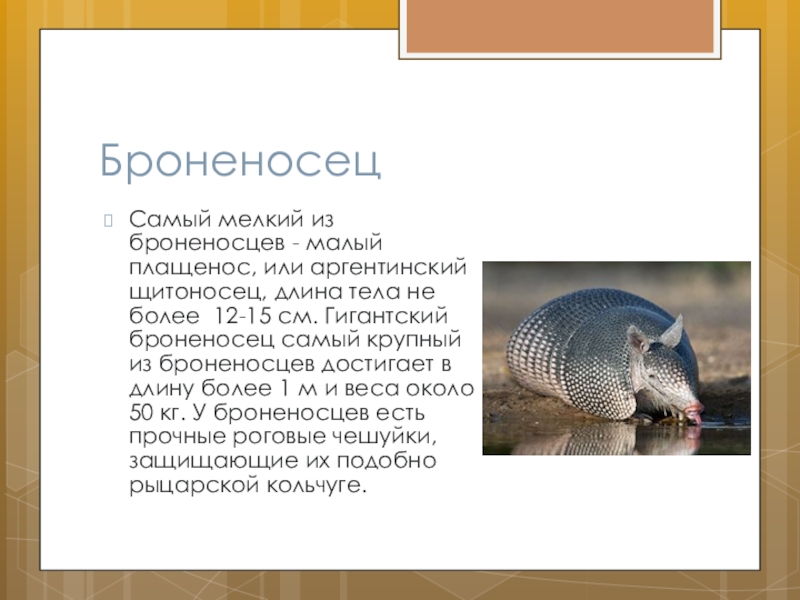 тела не более 12-15 см. Гигантский броненосец самый крупный из броненосцев достигает в длину более 1 м и веса около 50 кг. У броненосцев есть прочные роговые чешуйки, защищающие их подобно рыцарской кольчуге.