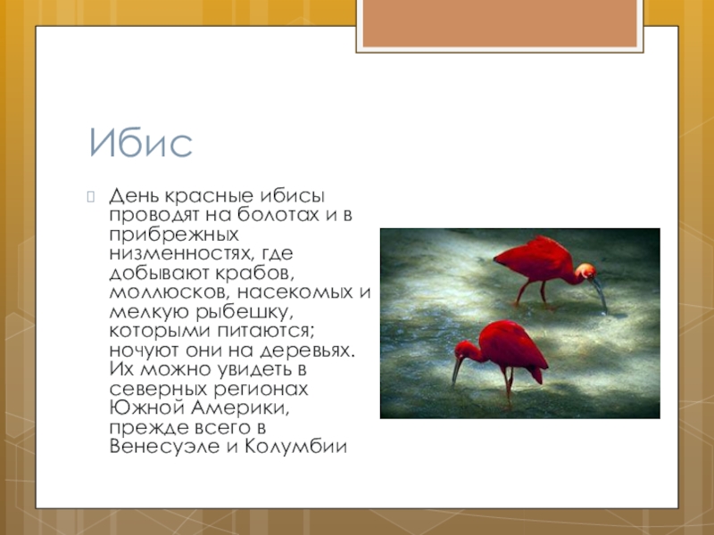 ИбисДень красные ибисы проводят на болотах и в прибрежных низменностях, где добывают крабов, моллюсков, насекомых и мелкую