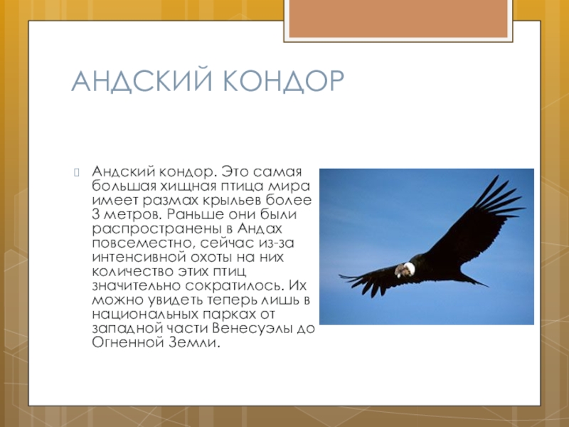 АНДСКИЙ КОНДОР Андский кондор. Это самая большая хищная птица мира имеет размах крыльев более 3 метров. Раньше они были распространены в Андах повсеместно, сейчас из-за интенсивной охоты на них количество этих птиц значительно сократилось. Их можно