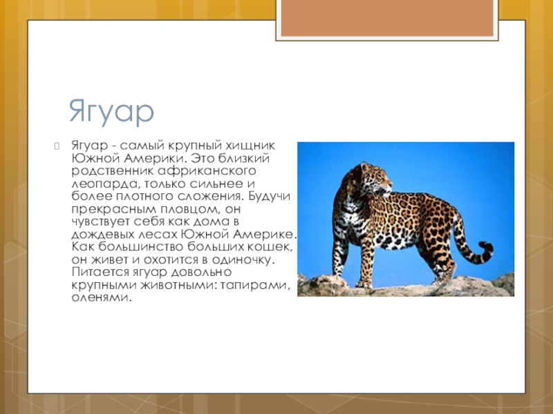 ЯгуарЯгуар - самый крупный хищник Южной Америки. Это близкий родственник африканского леопарда, только сильнее и более плотного