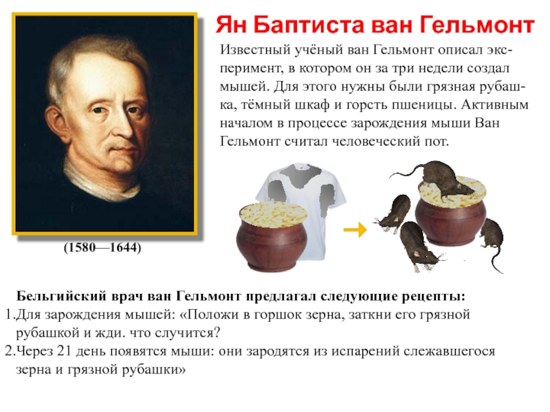 Известный учёный ван Гельмонт описал экс-перимент, в котором он за три недели создал мышей. Для этого нужны были грязная рубаш-ка, тёмный шкаф и горсть пшеницы. Активным началом в процессе зарождения мыши Ван Гельмонт считал человеческий пот.