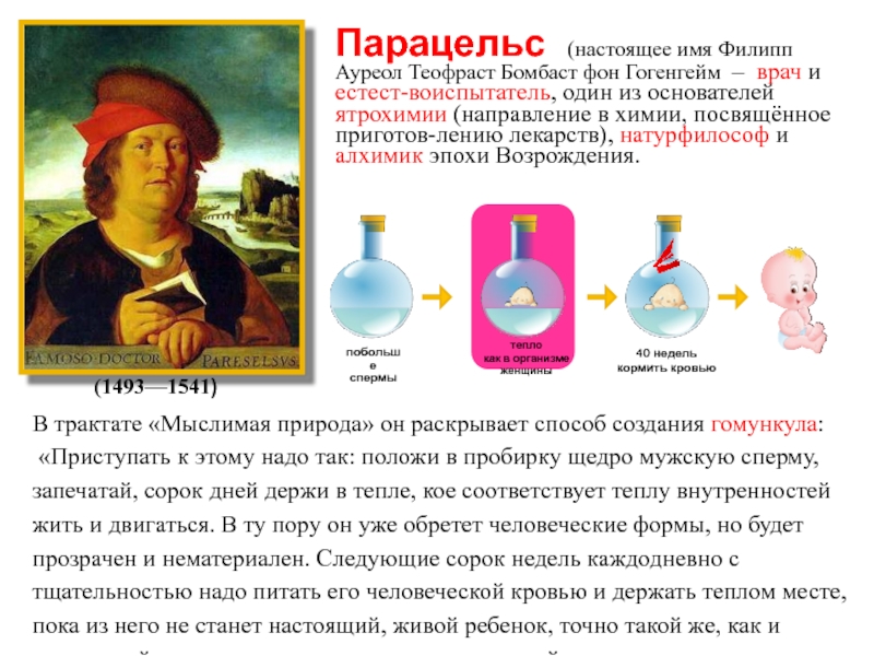 «Приступать к этому надо так: положи в пробирку щедро мужскую сперму, запечатай, сорок дней держи в тепле, кое соответствует теплу внутренностей жить и двигаться. В ту пору он уже обретет человеческие формы, но будет прозрачен и нематериален. Следующие сорок недель каждодневно с тщательностью надо питать его человеческой кровью и держать теплом месте, пока из него не станет настоящий, живой ребенок, точно такой же, как и рожденный от женщины, только намного меньший.