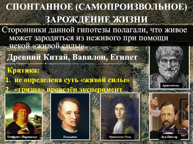 Согласно гипотезе Аристотеля о спонтанном зарождении, определенные “частицы” вещества содержат некое “активное начало”, которое при подхо-дящих условиях может создать живой организм.