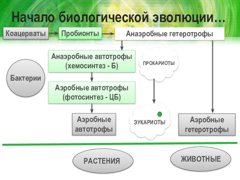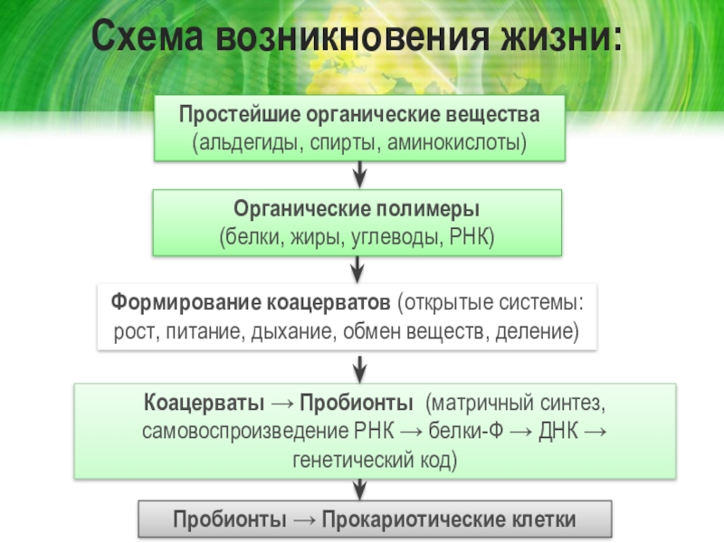 Коацерваты → Пробионты (матричный синтез, самовоспроизведение РНК → белки-Ф → ДНК → генетический код)
