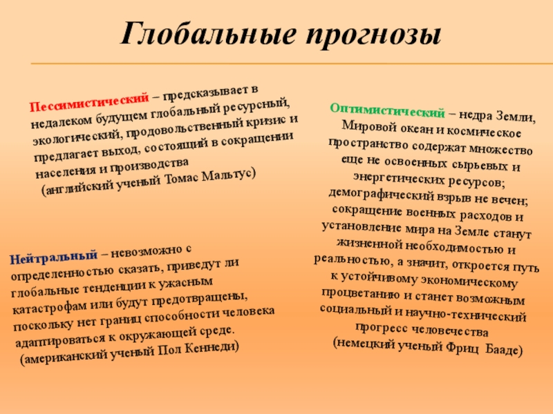 Пессимистический – предсказывает в недалеком будущем глобальный ресурсный, экологический, продовольственный кризис и предлагает выход, состоящий в сокращении населения и производства