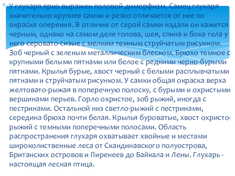 и резко отличается от нее по окраске оперения. В отличие от серой самки издали он кажется черным, однако на самом деле голова, шея, спина и бока тела у него серовато-сизые с мелким темным струйчатым рисунком. Зоб черный с зеленым металлическим блеском. Брюхо темное с крупными белыми пятнами или белое с редкими черно-бурыми пятнами. Крылья бурые, хвост черный с белыми расплывчатыми пятнами и струйчатым рисунком. У самки общая окраска верха желтовато-рыжая в поперечную полоску, с бурыми и охристыми вершинами перьев. Горло охристое, зоб рыжий, иногда с пестринами. Остальной низ светло-рыжий с пестринами, середина брюха почти белая. Крылья буроватые, хвост охристо-рыжий с темными поперечными полосами. Область распространения глухаря охватывает хвойные и местами широколиственные леса от Скандинавского полуострова, Британских островов и Пиренеев до Байкала и Лены. Глухарь - настоящая лесная птица.