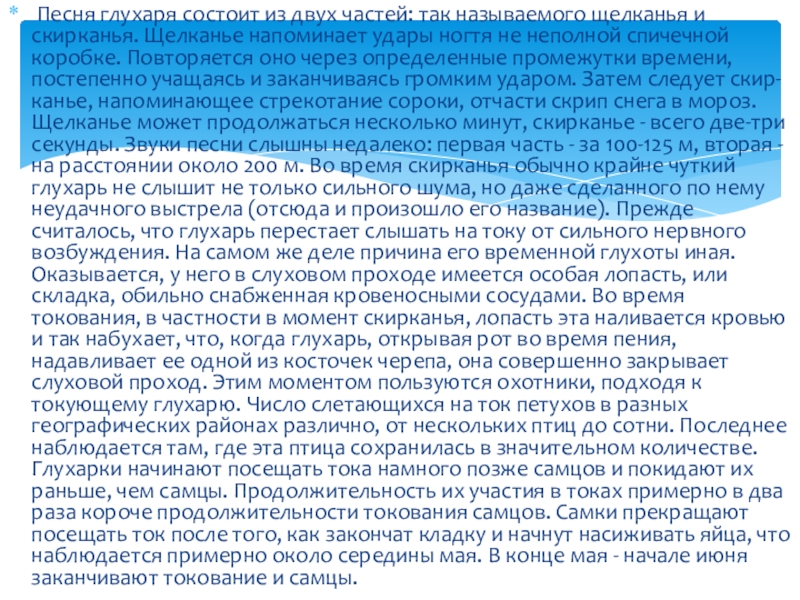 скирканья. Щелканье напоминает удары ногтя не неполной спичечной коробке. Повторяется оно через определенные промежутки времени, постепенно учащаясь и заканчиваясь громким ударом. Затем следует скир-канье, напоминающее стрекотание сороки, отчасти скрип снега в мороз. Щелканье может продолжаться несколько минут, скирканье - всего две-три секунды. Звуки песни слышны недалеко: первая часть - за 100-125 м, вторая - на расстоянии около 200 м. Во время скирканья обычно крайне чуткий глухарь не слышит не только сильного шума, но даже сделанного по нему неудачного выстрела (отсюда и произошло его название). Прежде считалось, что глухарь перестает слышать на току от сильного нервного возбуждения. На самом же деле причина его временной глухоты иная. Оказывается, у него в слуховом проходе имеется особая лопасть, или складка, обильно снабженная кровеносными сосудами. Во время токования, в частности в момент скирканья, лопасть эта наливается кровью и так набухает, что, когда глухарь, открывая рот во время пения, надавливает ее одной из косточек черепа, она совершенно закрывает слуховой проход. Этим моментом пользуются охотники, подходя к токующему глухарю. Число слетающихся на ток петухов в разных географических районах различно, от нескольких птиц до сотни. Последнее наблюдается там, где эта птица сохранилась в значительном количестве. Глухарки начинают посещать тока намного позже самцов и покидают их раньше, чем самцы. Продолжительность их участия в токах примерно в два раза короче продолжительности токования самцов. Самки прекращают посещать ток после того, как закончат кладку и начнут насиживать яйца, что наблюдается примерно около середины мая. В конце мая - начале июня заканчивают токование и самцы.