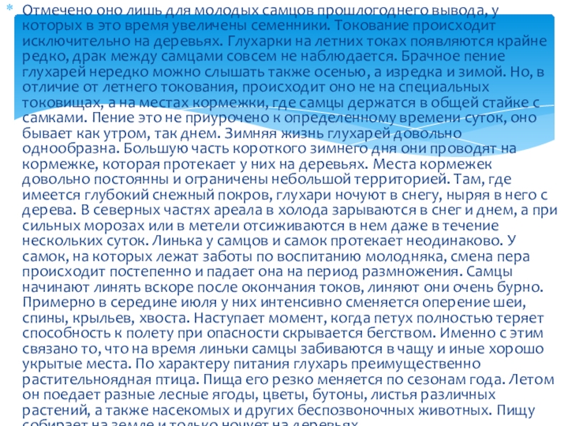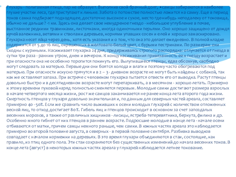 •самцы забираются в наиболее глухие участки леса, где приступают к линьке. Забота о потомстве полностью ложится на самку. Еще в период токов самка подбирает подходящее, достаточно высокое и сухое, место где-нибудь неподалеку от токовища, обычно не дальше ? -1 км. Здесь она делает свое немудреное гнездо - небольшое углубление в почве, выстланное редкими травинками, листочками, иногда одиночными перьями. Оно хорошо защищено от дождя кучей валежника, ветвями и стволами деревьев, корнями упавших сосен и елей и хорошо замаскировано. Глухарка несет яйца через день, хотя есть указания и о том, что она это делает ежедневно. В полной кладке содержится от 5 до 16 яиц, окрашенных в желтовато-белый цвет, с бурыми пестринами. По размерам они сходны с куриными. Насиживает глухарка 24 дня, придерживаясь строгого распорядка: отлучается от гнезда в сутки три раза - ранним утром, днем и вечером. К концу насиживания привязанность ее к гнезду возрастает и при опасности она не особенно торопится покинуть его. Вылупившиеся птенцы, едва обсохнув, свободно могут следовать за матерью. Первые дни они боятся холода и влаги и поэтому часто обогреваются под матерью. При опасности искусно прячутся и в 2 – 3 - дневном возрасте не могут быть найдены с собакой, так как же оставляют запаха. При встрече с человеком глухарка пытается отвести его от выводка. Растут птенцы довольно быстро и в десятидневном возрасте могут перепархивать, а в месячном - хорошо летать. Примерно к этому времени пуховой наряд полностью сменяется перовым. Молодые самки достигают размера взрослых в начале четвертого месяца жизни, рост же самцов заканчивается не ранее конца лета второго года жизни. Смертность птенцов у глухаря довольно значительная и, по данным для северных частей ареала, составляет примерно 40 - 50%. Если же сравнить число выживших к осени молодых глухарей с количеством отложенных весной яиц, то отход достигает 80 %. Гибель яиц и птенцов происходит в основном за счет запоздалых весенних морозов, а также от различных хищников - лисицы, ястреба-тетеревятника, беркута, филина и др. Особенно много гибнет от них птенцов в раннем возрасте. Подросшие молодые в конце лета - начале осени отбиваются от матки, причем самцы немного раньше, чем самки. В южных частях ареала это наблюдается примерно во второй половине августа, в северных - в первой половине сентября. Разбивка выводков совпадает с началом кормежки на деревьях. В это время глухари объединяются в стаи, состоящие, как правило, из птиц одного пола. Эти стаи сохраняются без существенных изменений до начала весенних токов. В конце лета (август) в некоторых южных частях ареала у глухарей наблюдается летнее токование.