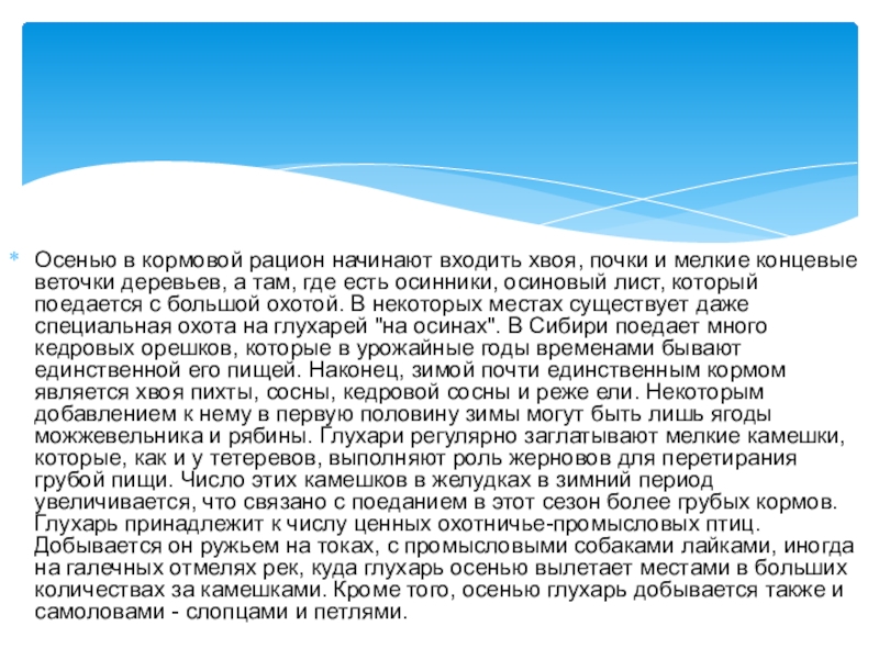веточки деревьев, а там, где есть осинники, осиновый лист, который поедается с большой охотой. В некоторых местах существует даже специальная охота на глухарей "на осинах". В Сибири поедает много кедровых орешков, которые в урожайные годы временами бывают единственной его пищей. Наконец, зимой почти единственным кормом является хвоя пихты, сосны, кедровой сосны и реже ели. Некоторым добавлением к нему в первую половину зимы могут быть лишь ягоды можжевельника и рябины. Глухари регулярно заглатывают мелкие камешки, которые, как и у тетеревов, выполняют роль жерновов для перетирания грубой пищи. Число этих камешков в желудках в зимний период увеличивается, что связано с поеданием в этот сезон более грубых кормов. Глухарь принадлежит к числу ценных охотничье-промысловых птиц. Добывается он ружьем на токах, с промысловыми собаками лайками, иногда на галечных отмелях рек, куда глухарь осенью вылетает местами в больших количествах за камешками. Кроме того, осенью глухарь добывается также и самоловами - слопцами и петлями.