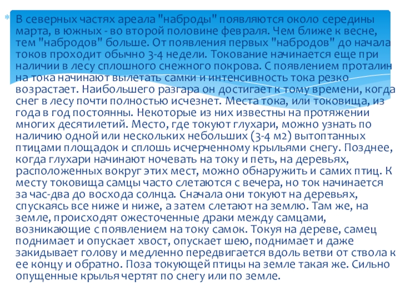 - во второй половине февраля. Чем ближе к весне, тем "набродов" больше. От появления первых "набродов" до начала токов проходит обычно 3-4 недели. Токование начинается еще при наличии в лесу сплошного снежного покрова. С появлением проталин на тока начинают вылетать самки и интенсивность тока резко возрастает. Наибольшего разгара он достигает к тому времени, когда снег в лесу почти полностью исчезнет. Места тока, или токовища, из года в год постоянны. Некоторые из них известны на протяжении многих десятилетий. Место, где токуют глухари, можно узнать по наличию одной или нескольких небольших (3-4 м2) вытоптанных птицами площадок и сплошь исчерченному крыльями снегу. Позднее, когда глухари начинают ночевать на току и петь, на деревьях, расположенных вокруг этих мест, можно обнаружить и самих птиц. К месту токовища самцы часто слетаются с вечера, но ток начинается за час-два до восхода солнца. Сначала они токуют на деревьях, спускаясь все ниже и ниже, а затем слетают на землю. Там же, на земле, происходят ожесточенные драки между самцами, возникающие с появлением на току самок. Токуя на дереве, самец поднимает и опускает хвост, опускает шею, поднимает и даже закидывает голову и медленно передвигается вдоль ветви от ствола к ее концу и обратно. Поза токующей птицы на земле такая же. Сильно опущенные крылья чертят по снегу или по земле.