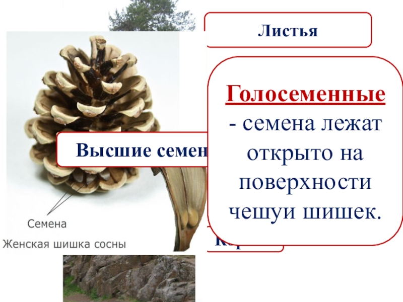 КореньСтебель (ствол)ЛистьяВысшие семенные растенияГолосеменные - семена лежат открыто на поверхности чешуи шишек.