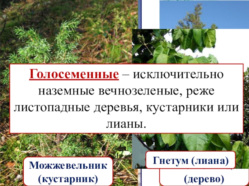 Слайд 2Голосеменные – исключительно наземные вечнозеленые, реже листопадные деревья, кустарники или лианы.