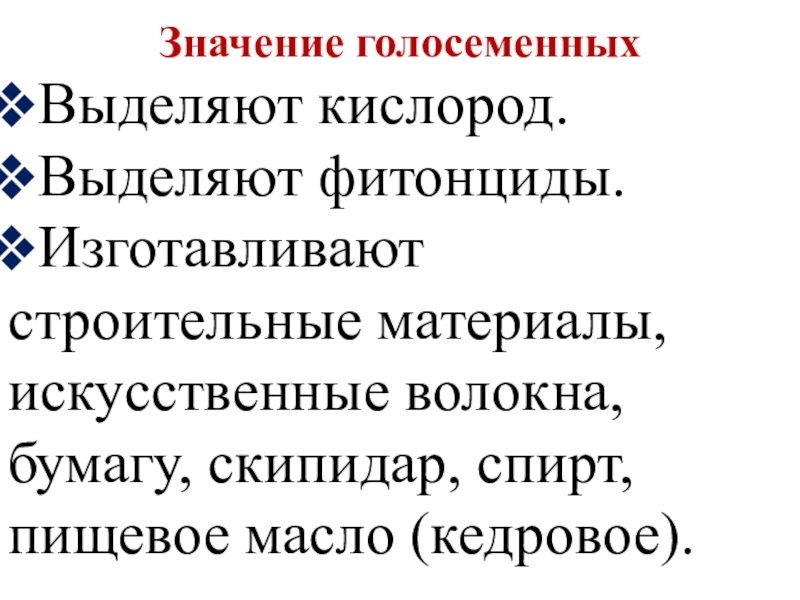 Значение голосеменныхВыделяют кислород.Выделяют фитонциды.Изготавливают строительные материалы, искусственные волокна, бумагу, скипидар, спирт, пищевое масло (кедровое).