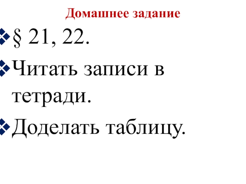 Домашнее задание§ 21, 22.Читать записи в тетради.Доделать таблицу.