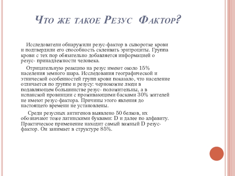 Отрицательную реакцию на резус имеют около 15% населения земного шара. Исследования географической и этнической особенностей групп крови показало, что население отличается по группе и резусу: чернокожие люди в подавляющем большинстве резус- положительны, а в испанской провинции с проживающими басками 30% жителей не имеют резус-фактора. Причины этого явления до настоящего времени не установлены.