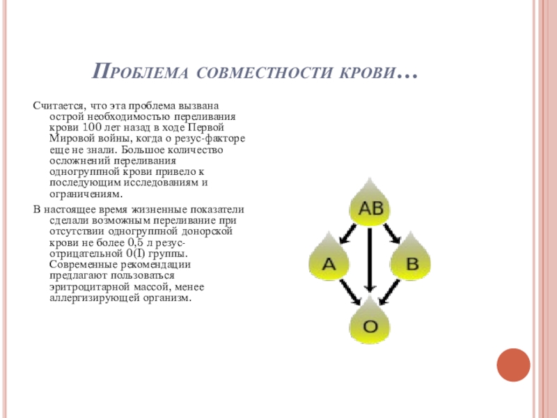 В настоящее время жизненные показатели сделали возможным переливание при отсутствии одногруппной донорской крови не более 0,5 л резус-отрицательной 0(I) группы. Современные рекомендации предлагают пользоваться эритроцитарной массой, менее аллергизирующей организм.