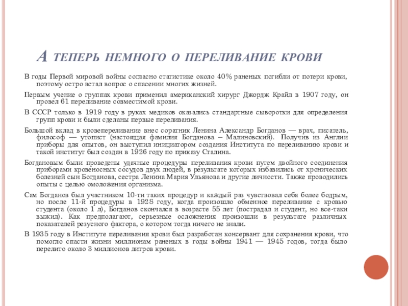 Большой вклад в кровепереливание внес соратник Ленина Александр Богданов — врач, писатель, философ — утопист (настоящая фамилия Богданова – Малиновский). Получив из Англии приборы для опытов, он выступил инициатором создания Института по переливанию крови и такой институт был создан в 1926 году по приказу Сталина.