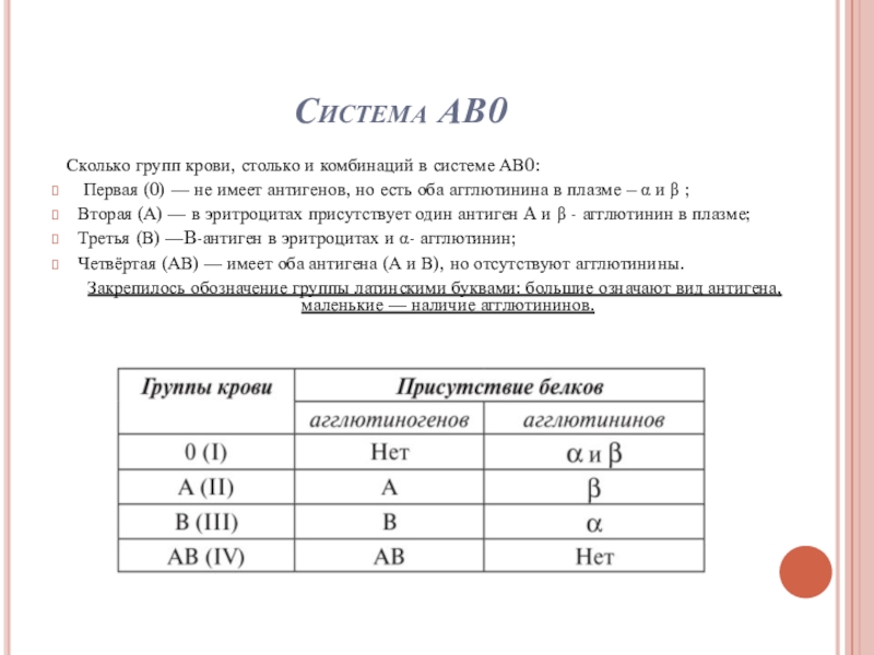 Первая (0) — не имеет антигенов, но есть оба агглютинина в плазме – α и β ;