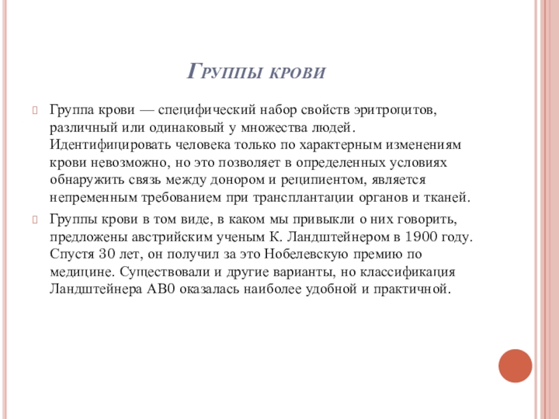 Группа крови — специфический набор свойств эритроцитов, различный или одинаковый