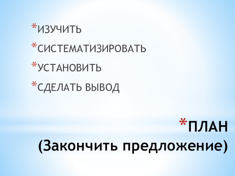 ПЛАН (Закончить предложение)ИЗУЧИТЬСИСТЕМАТИЗИРОВАТЬУСТАНОВИТЬСДЕЛАТЬ ВЫВОД