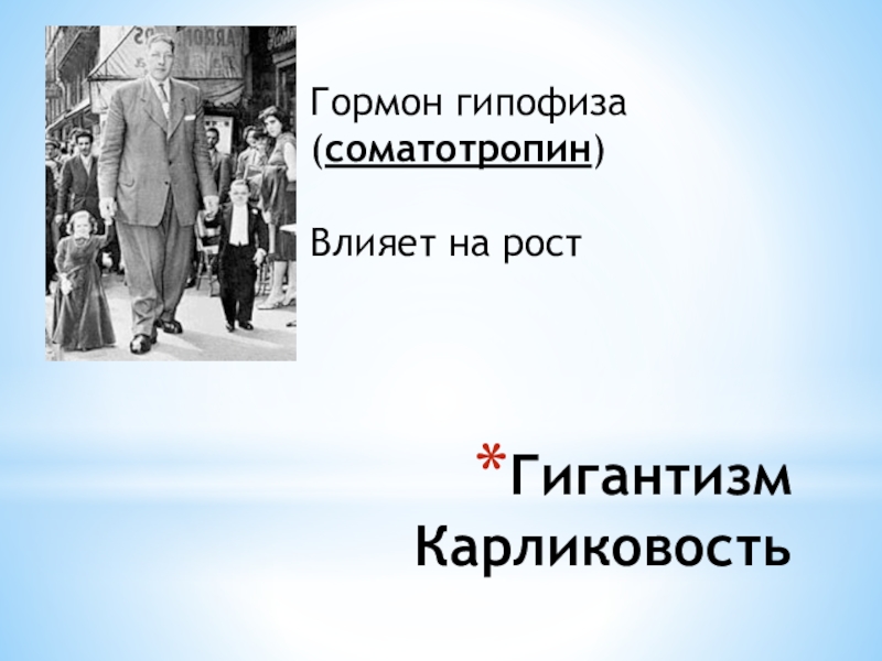 Гигантизм  КарликовостьГормон гипофиза (соматотропин)Влияет на рост