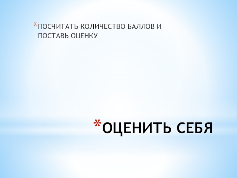 ОЦЕНИТЬ СЕБЯПОСЧИТАТЬ КОЛИЧЕСТВО БАЛЛОВ И ПОСТАВЬ ОЦЕНКУ