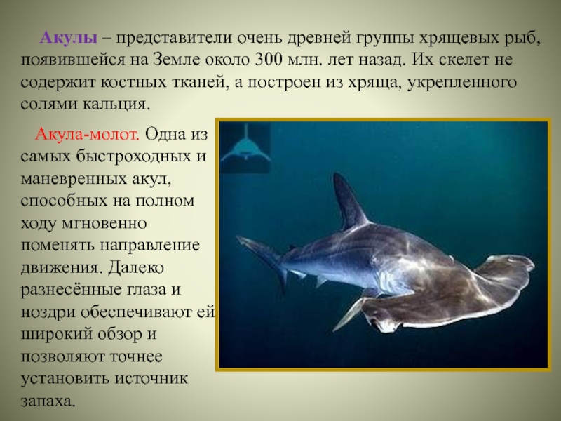 Акула-молот. Одна из самых быстроходных и маневренных акул, способных на полном ходу мгновенно поменять направление движения. Далеко разнесённые глаза и ноздри обеспечивают ей широкий обзор и позволяют точнее установить источник запаха.