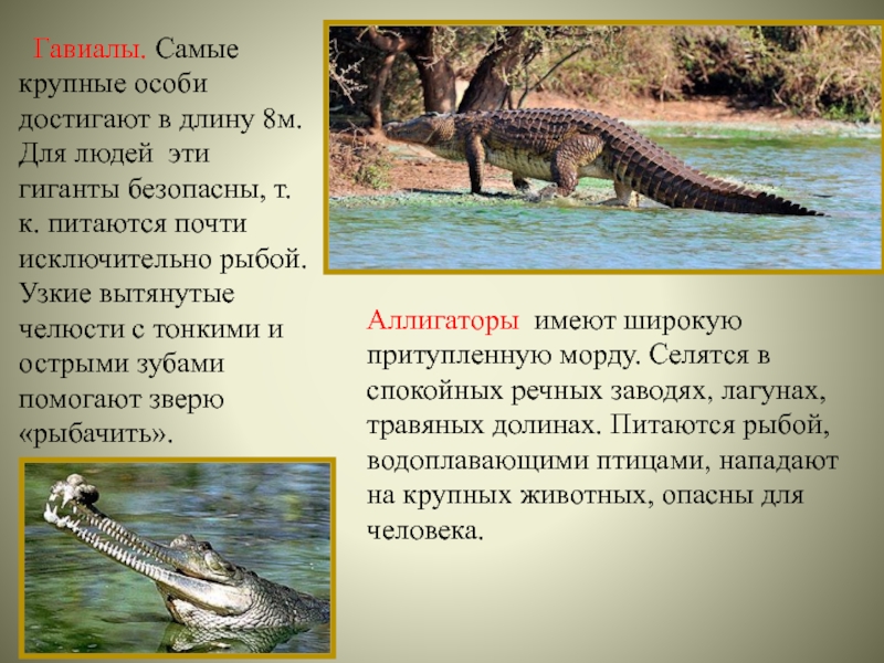 Аллигаторы имеют широкую притупленную морду. Селятся в спокойных речных заводях, лагунах, травяных долинах. Питаются рыбой, водоплавающими птицами, нападают на крупных животных, опасны для человека.