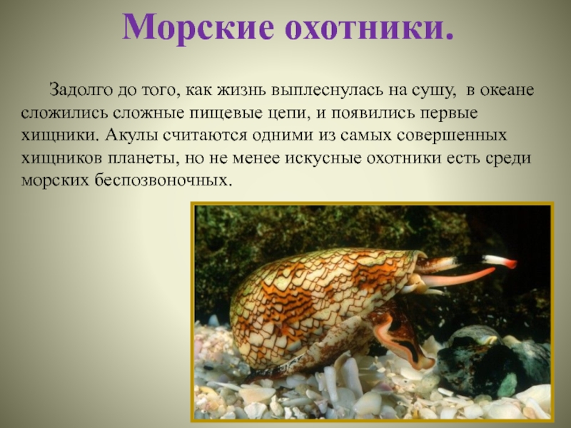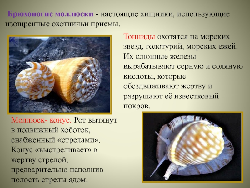Моллюск- конус. Рот вытянут в подвижный хоботок, снабженный «стрелами». Конус «выстреливает» в жертву стрелой, предварительно наполнив полость стрелы ядом.