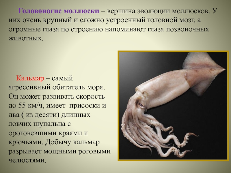 Кальмар – самый агрессивный обитатель моря. Он может развивать скорость до 55 км/ч, имеет присоски и два ( из десяти) длинных ловчих щупальца с ороговевшими краями и крючьями. Добычу кальмар разрывает мощными роговыми челюстями.