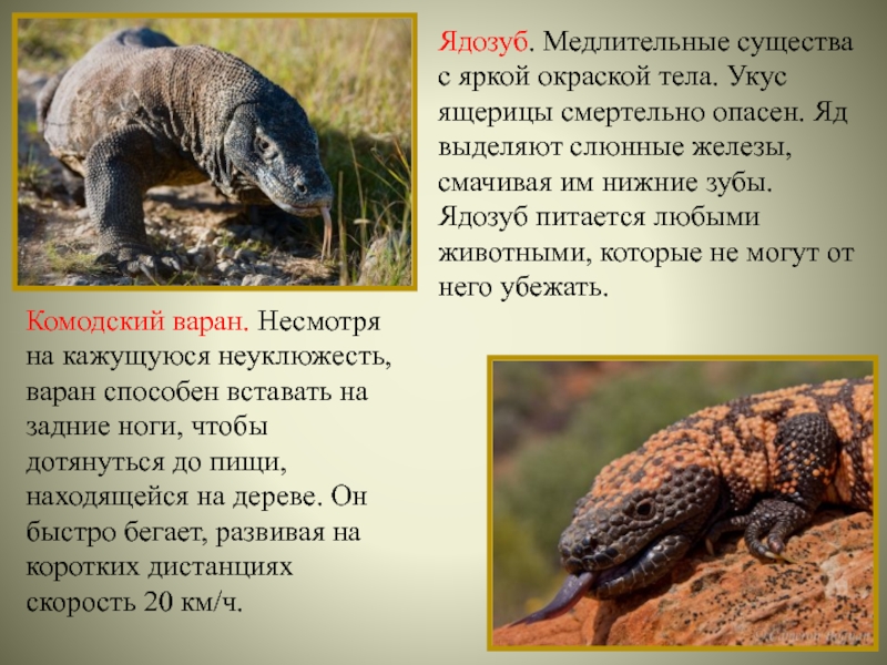 Ядозуб. Медлительные существа с яркой окраской тела. Укус ящерицы смертельно опасен. Яд выделяют слюнные железы, смачивая им нижние зубы. Ядозуб питается любыми животными, которые не могут от него убежать.