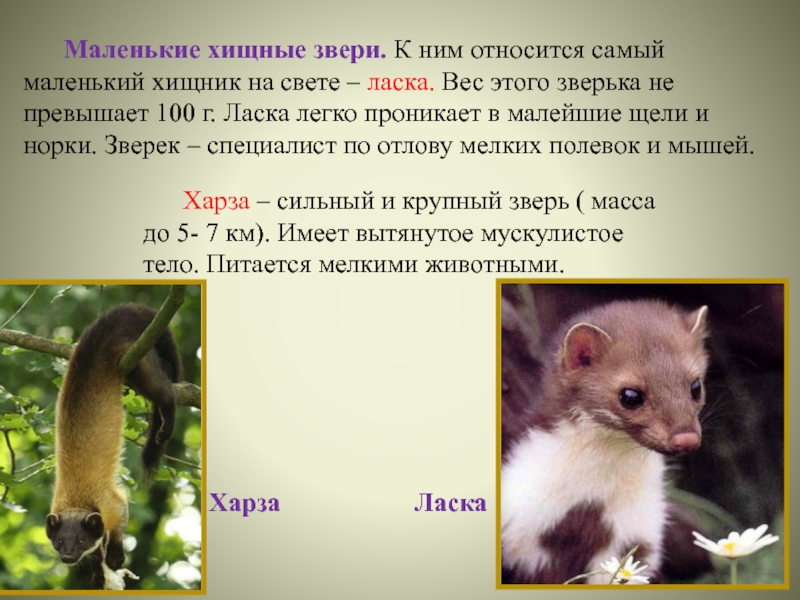 Харза – сильный и крупный зверь ( масса до 5- 7 км). Имеет вытянутое мускулистое тело. Питается мелкими животными.