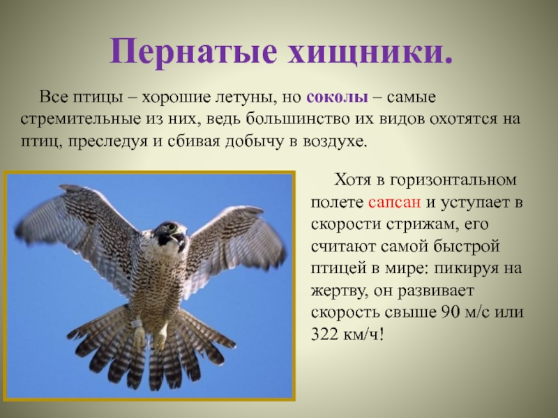 Хотя в горизонтальном полете сапсан и уступает в скорости стрижам, его считают самой быстрой птицей в мире: пикируя на жертву, он развивает скорость свыше 90 м/с или 322 км/ч!