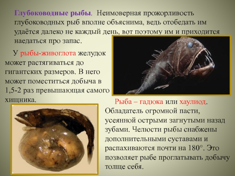 У рыбы-живоглота желудок может растягиваться до гигантских размеров. В него может поместиться добыча в 1,5-2 раз превышающая самого хищника.