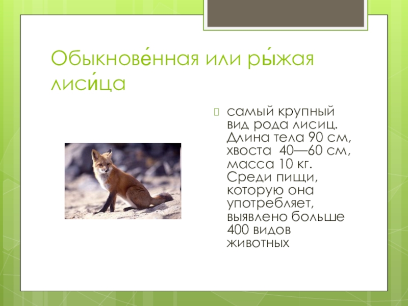 Слайд 4Обыкнове́нная или ры́жая лиси́ца