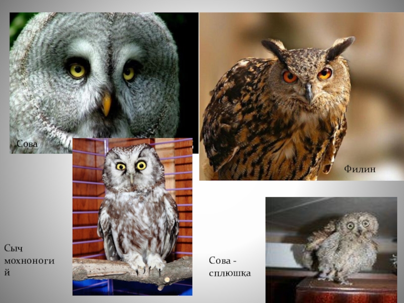 Они имеют крупную голову и плоскую морду с большими круглыми, смотрящими вперед большими, выпуклыми глазами. Вокруг глаз кружки перьев, по всему телу - пушистые перья. Голова очень подвижна.