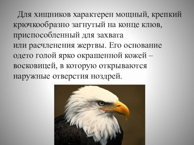 Слайд 9 Для хищников характерен мощный, крепкий крючкообразно загнутый на конце клюв,